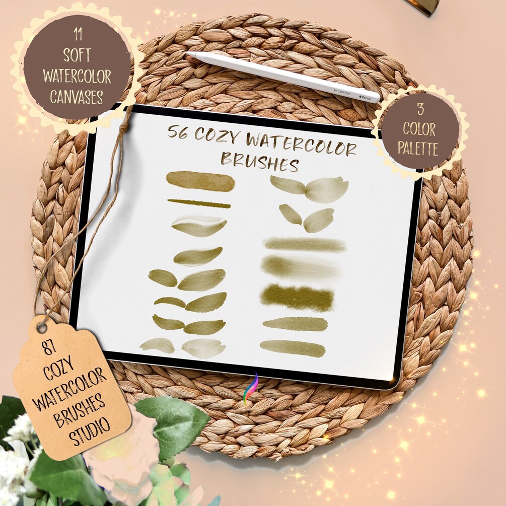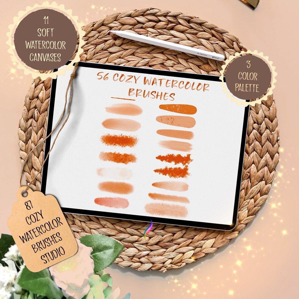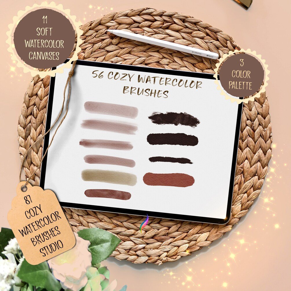 87 PROCREATE WATERCOLOR BRUSHES | 11 procreate watercolor canvas | 3 procreate color palette | procreate cozy watercolor brushes studio set